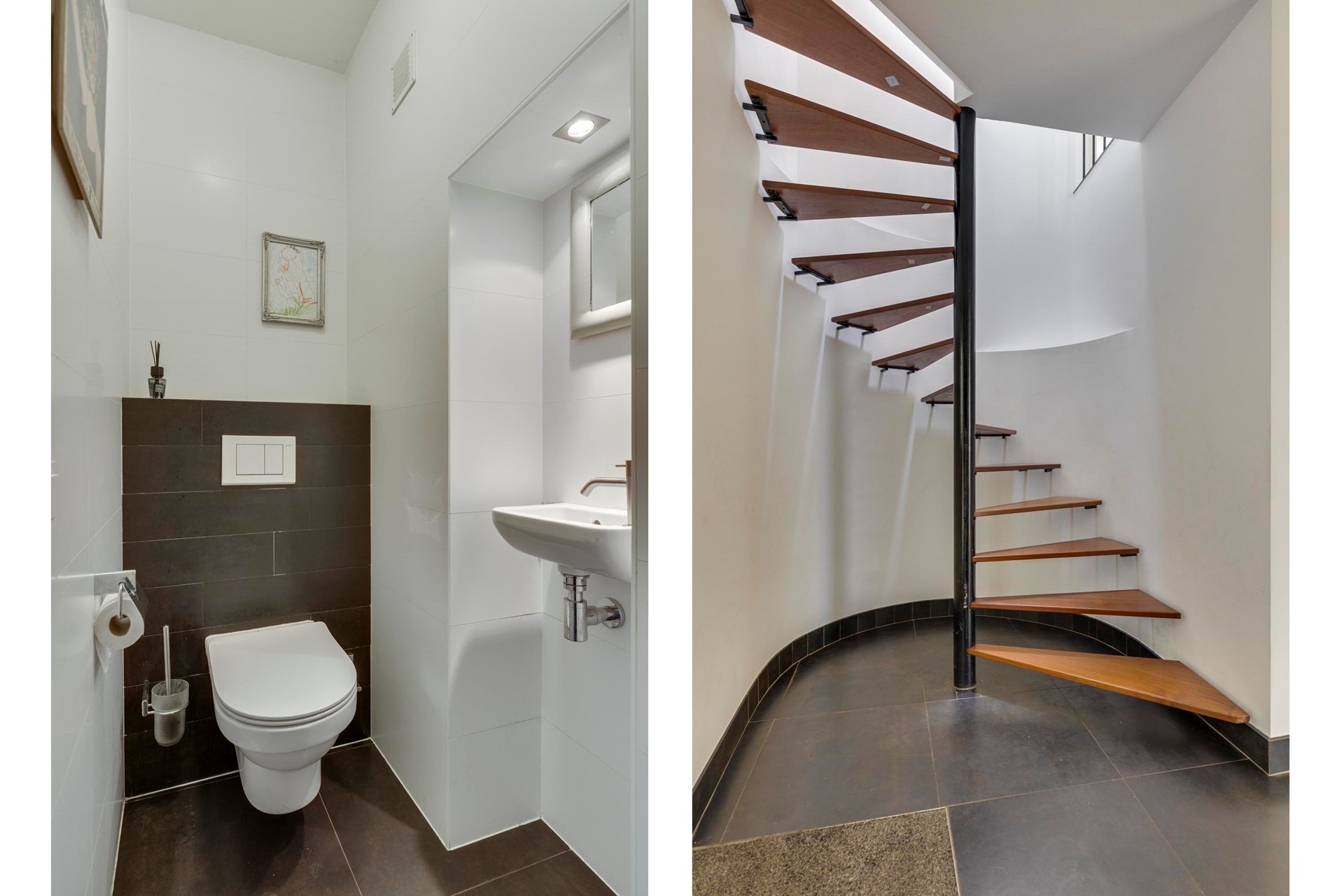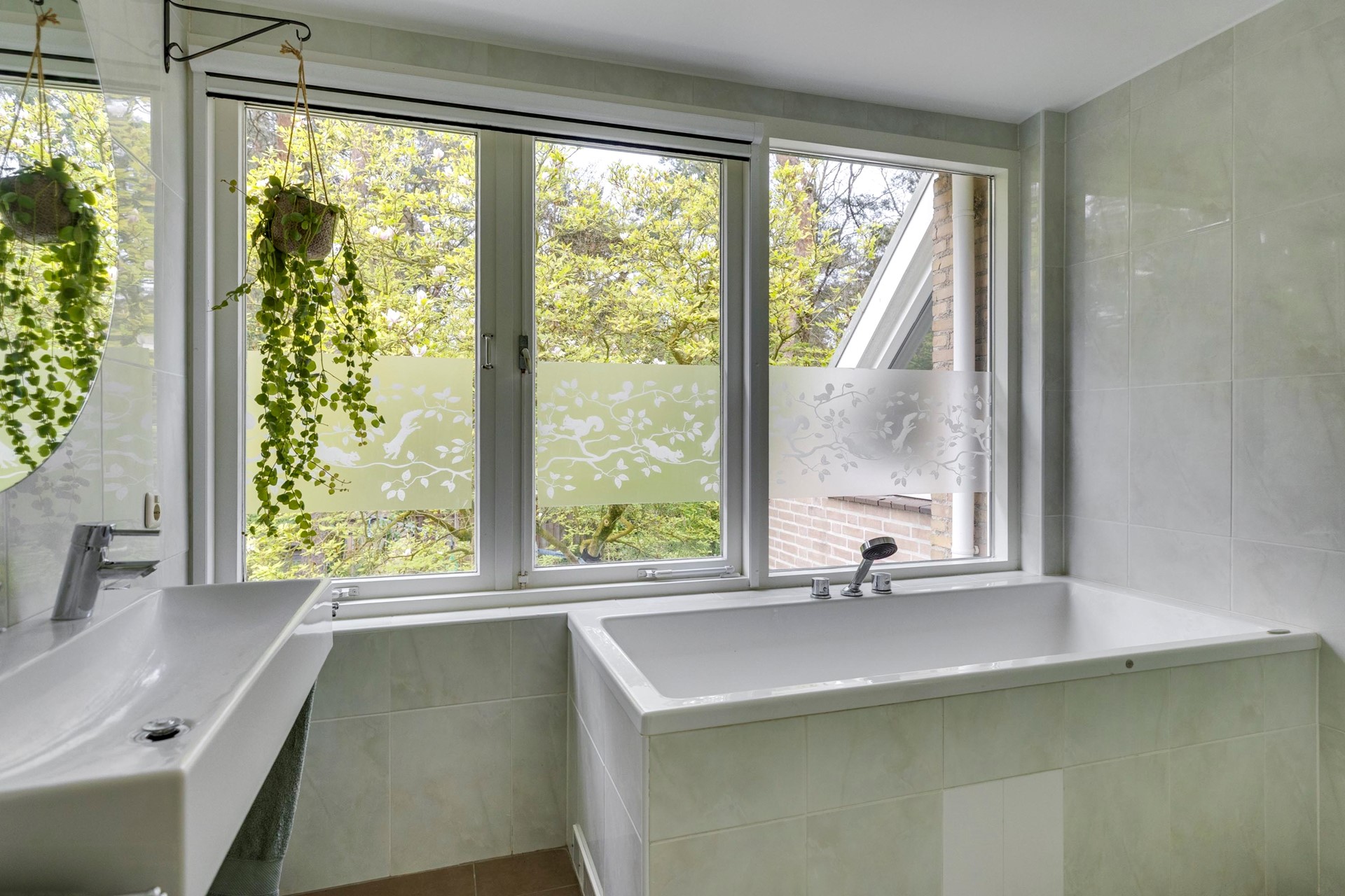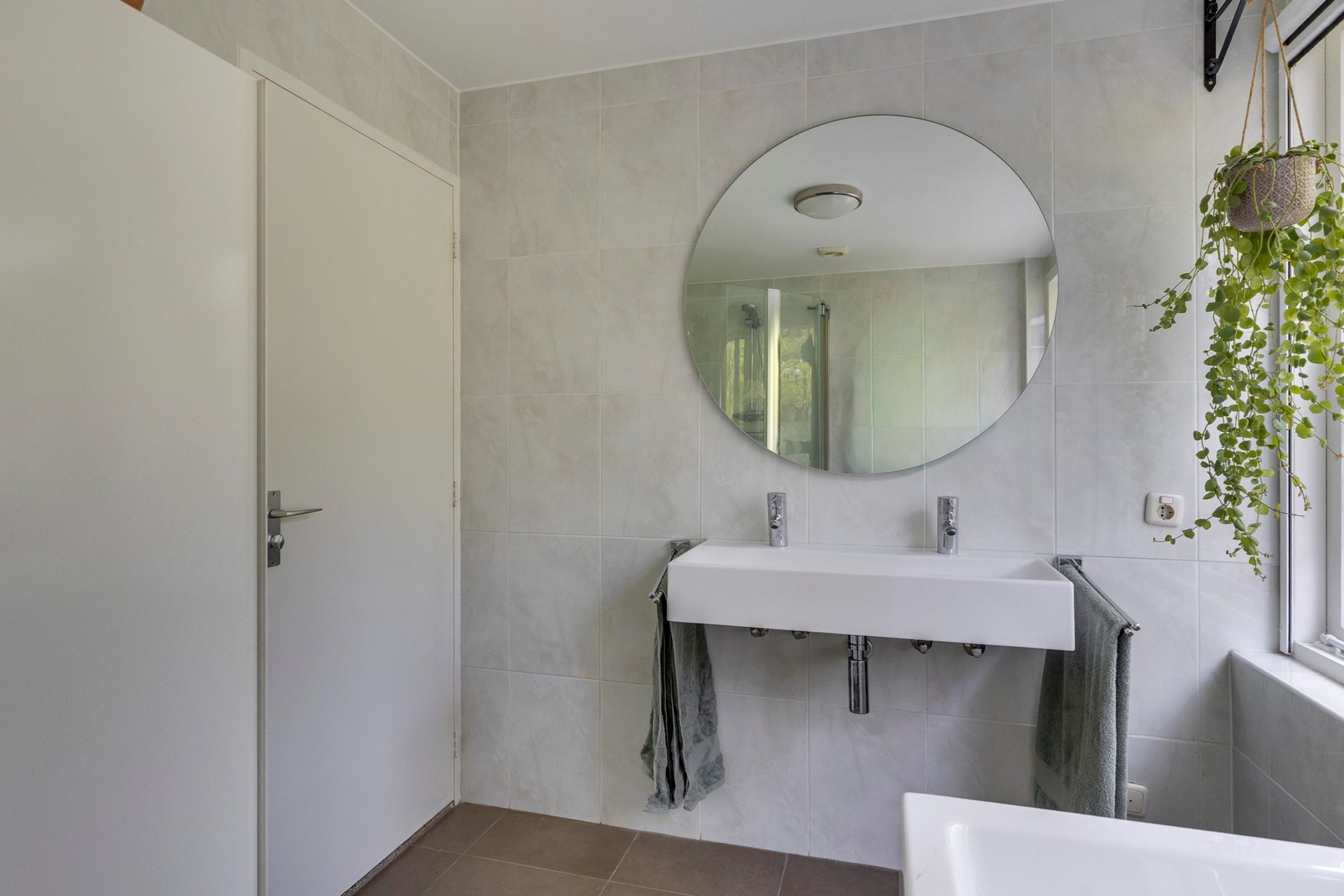 De badkamer is volledig betegeld en compleet ingericht met een ligbad, douchecabine en een dubbele wastafelmeubel. Daarnaast is er een separate, eveneens volledig betegelde toiletruimte met vrijdragend toilet en fonteintje.