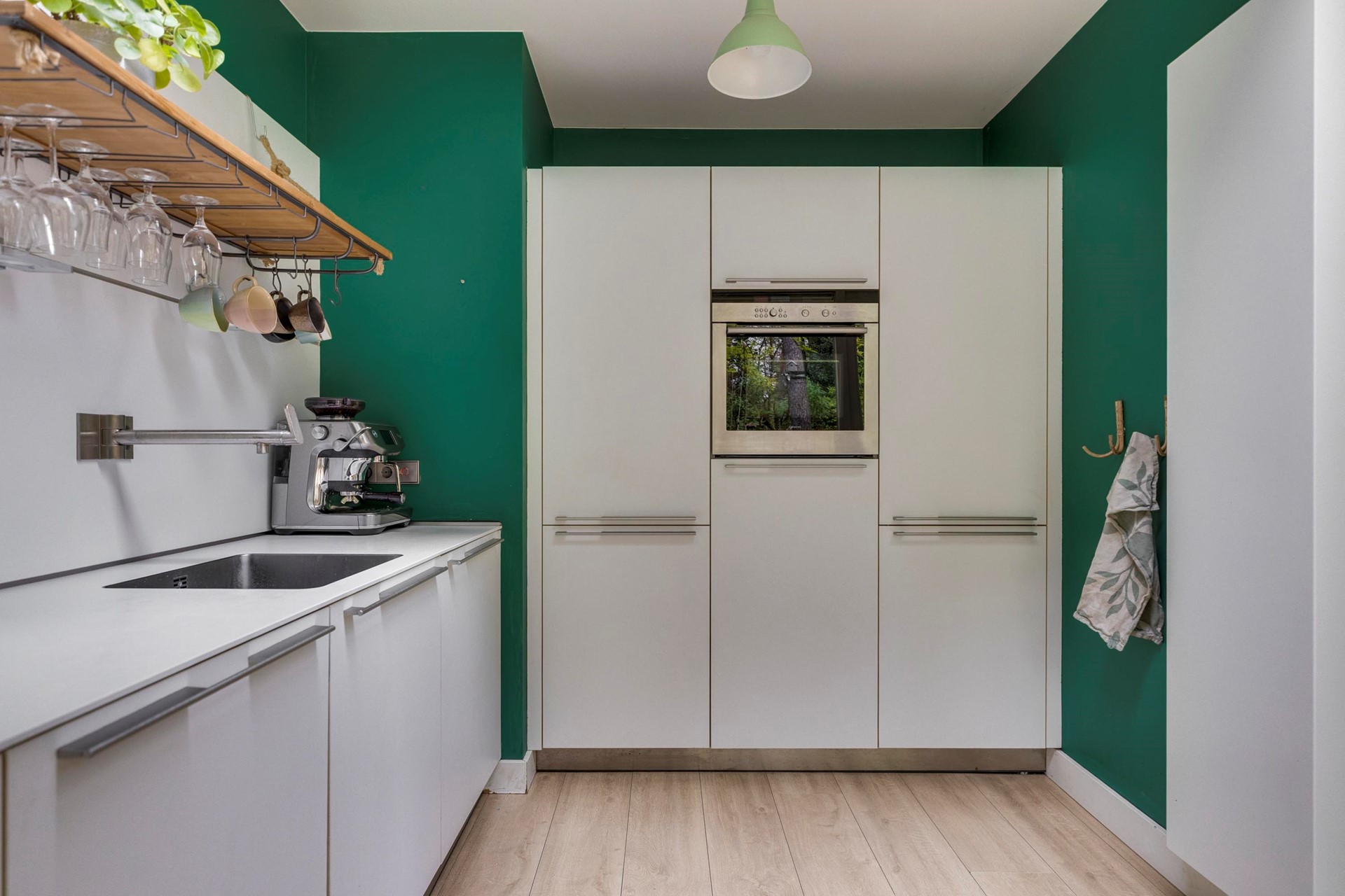 Aansluitend de open keuken met moderne wandopstelling en servicewand. U beschikt hier over een 5-pits inductie kookplaat, RVS-afzuigkap, koelkast, combi-magnetron en vaatwasser (alle apparatuur van Siemens). Daarnaast is er voldoende kastruimte en zijn er inbouwspots aanwezig.