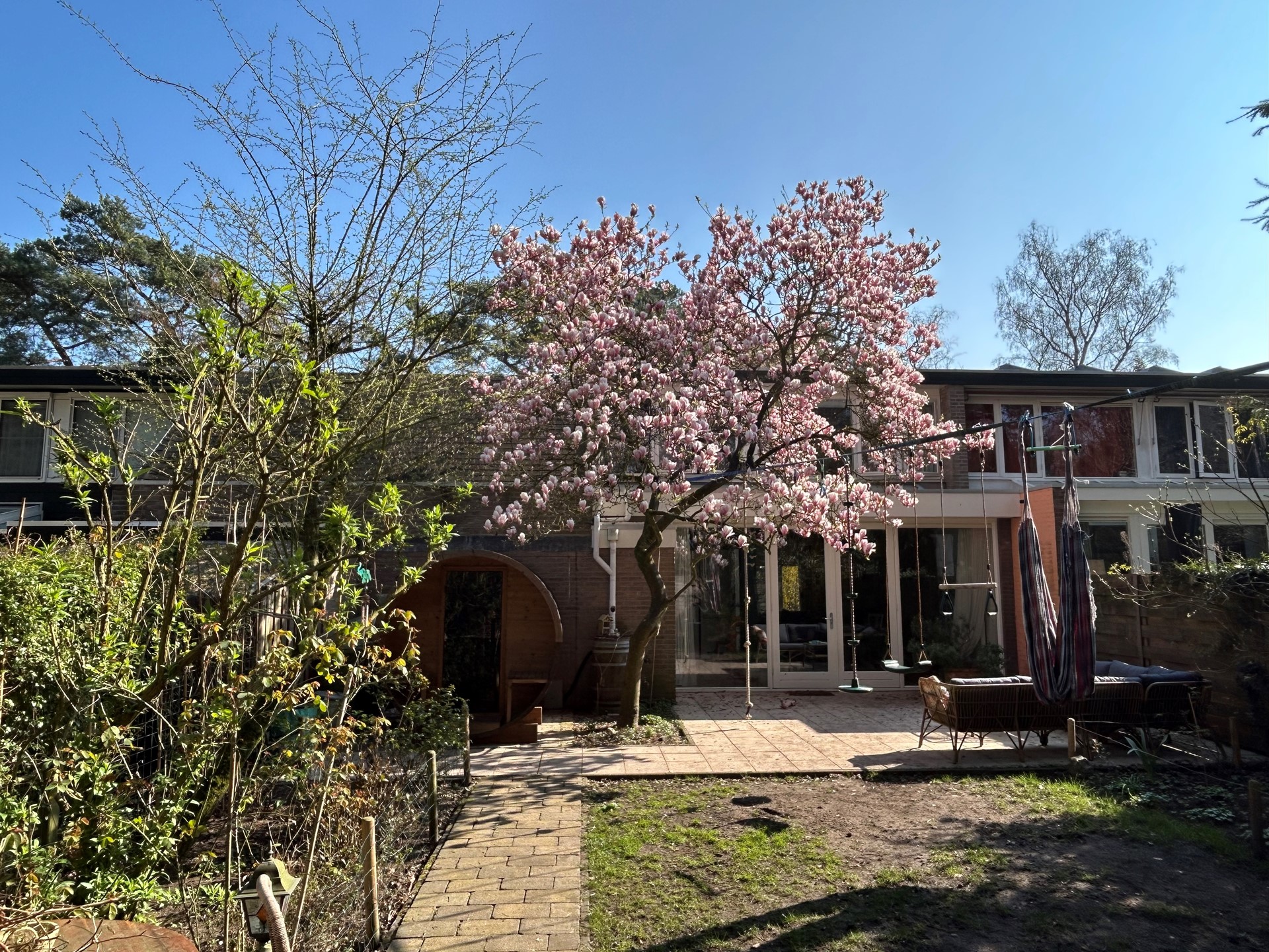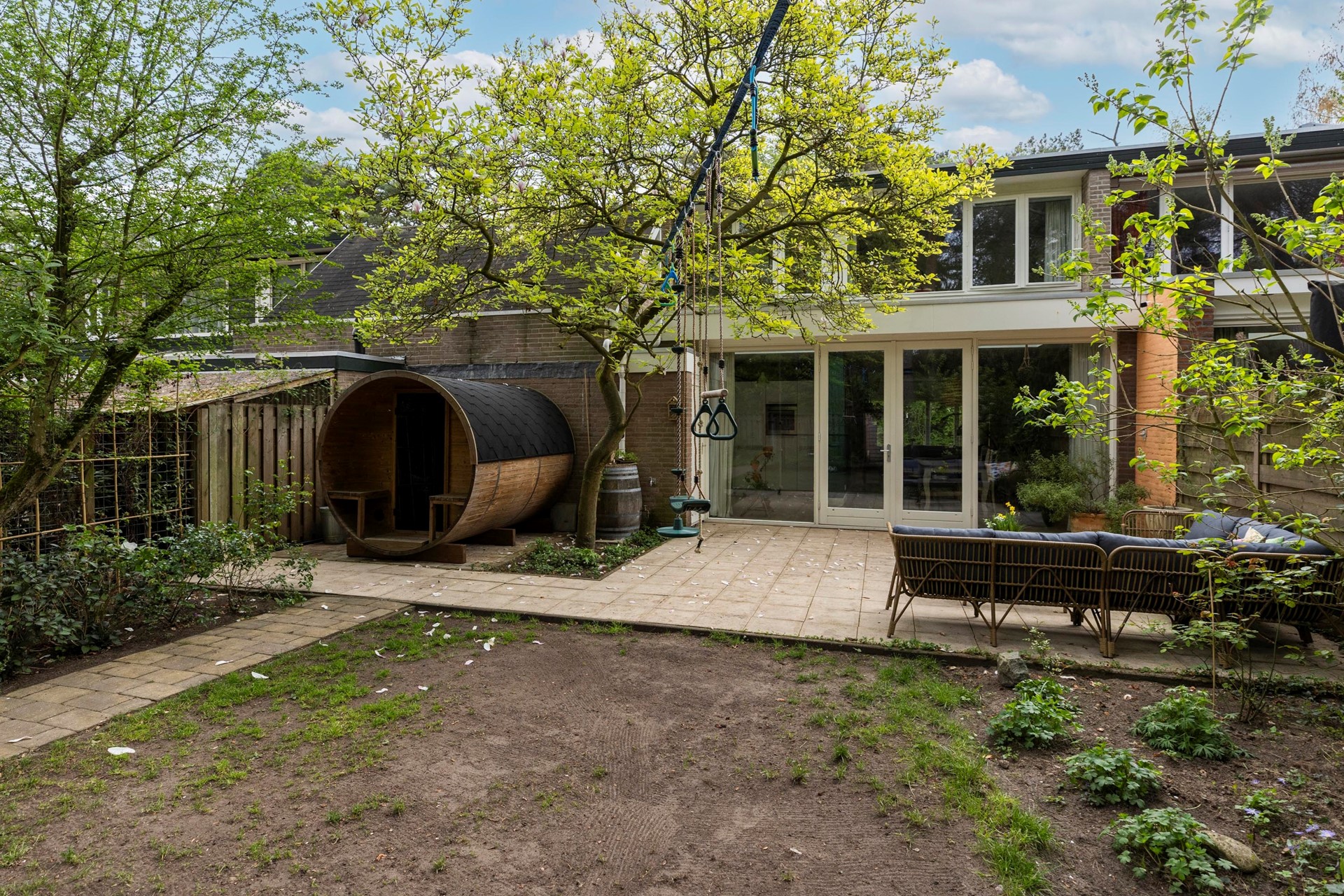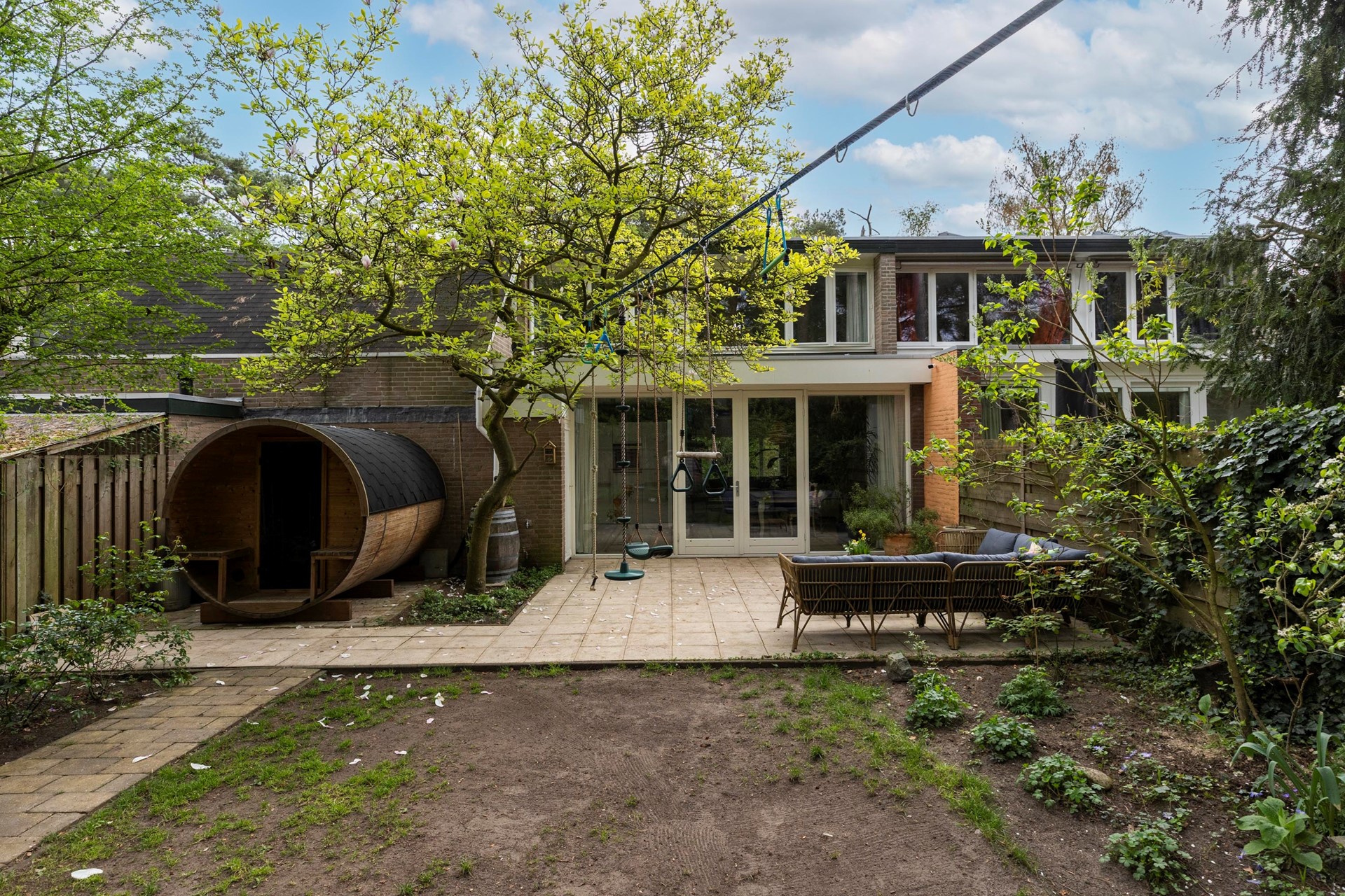 De achtertuin vormt een heerlijke plek om van het buitenleven te genieten. Deze royale, privacybiedende bostuin ligt op het zonnige zuidwesten en biedt meerdere terrassen, waaronder een terras direct aan huis en een tweede, sfeervolle plek verderop in de tuin. Met een achterom, buitenkraan, houten berging (1.75m bij 1.44m) én een saunacabine (ter overname) is het hier optimaal genieten. Bovendien loopt u vanuit de tuin zo de aangrenzende wandelbossen in – een