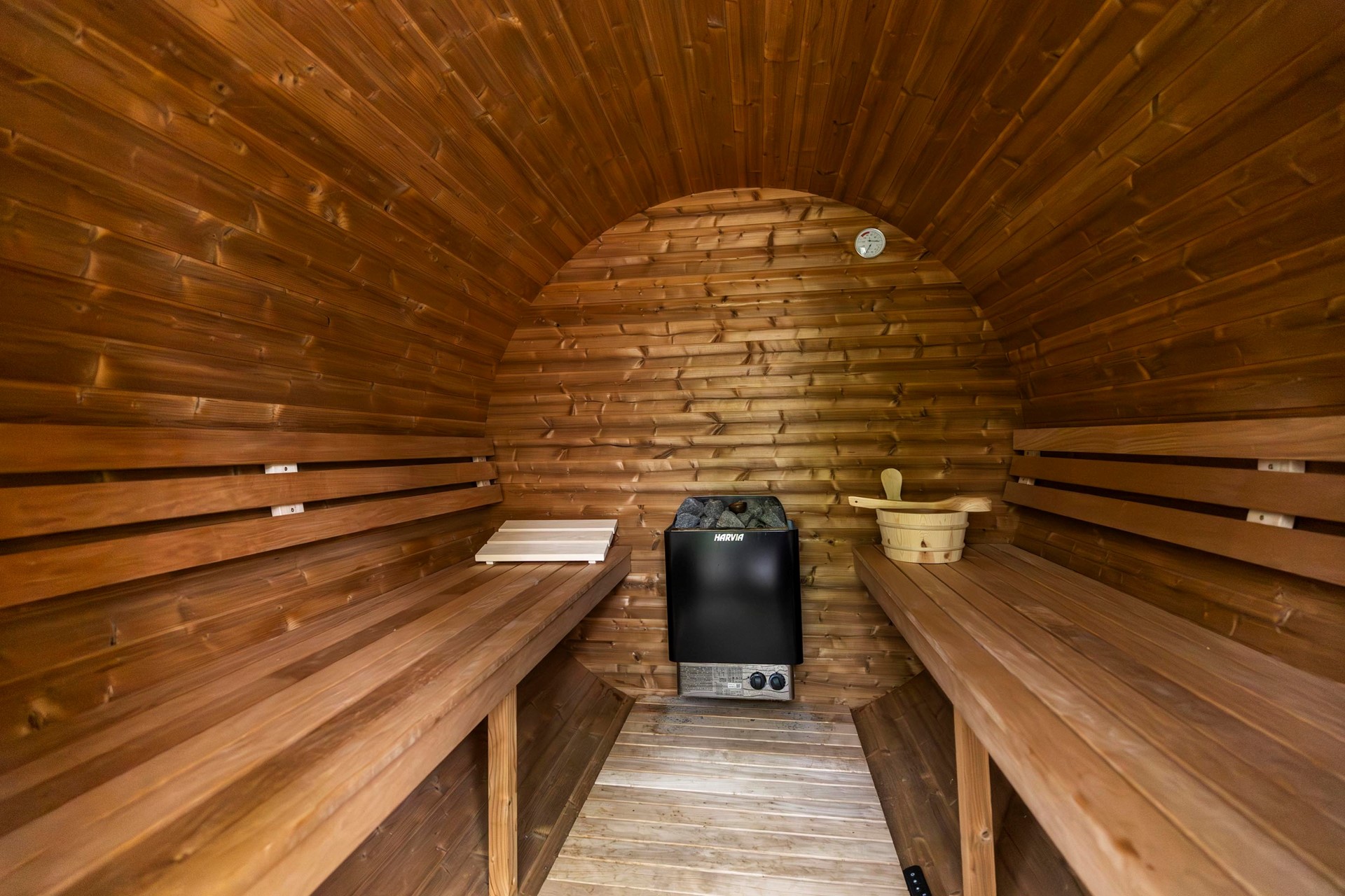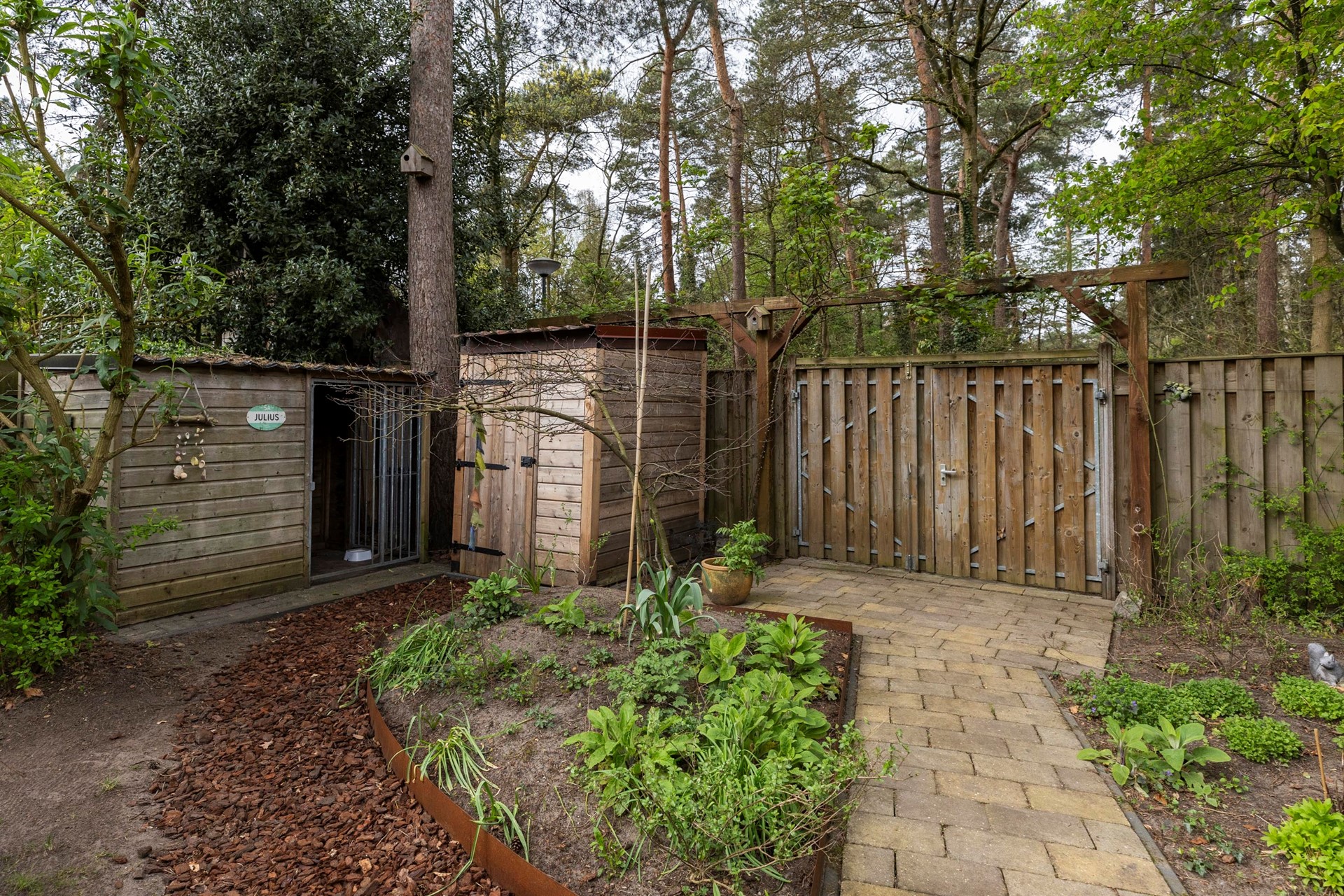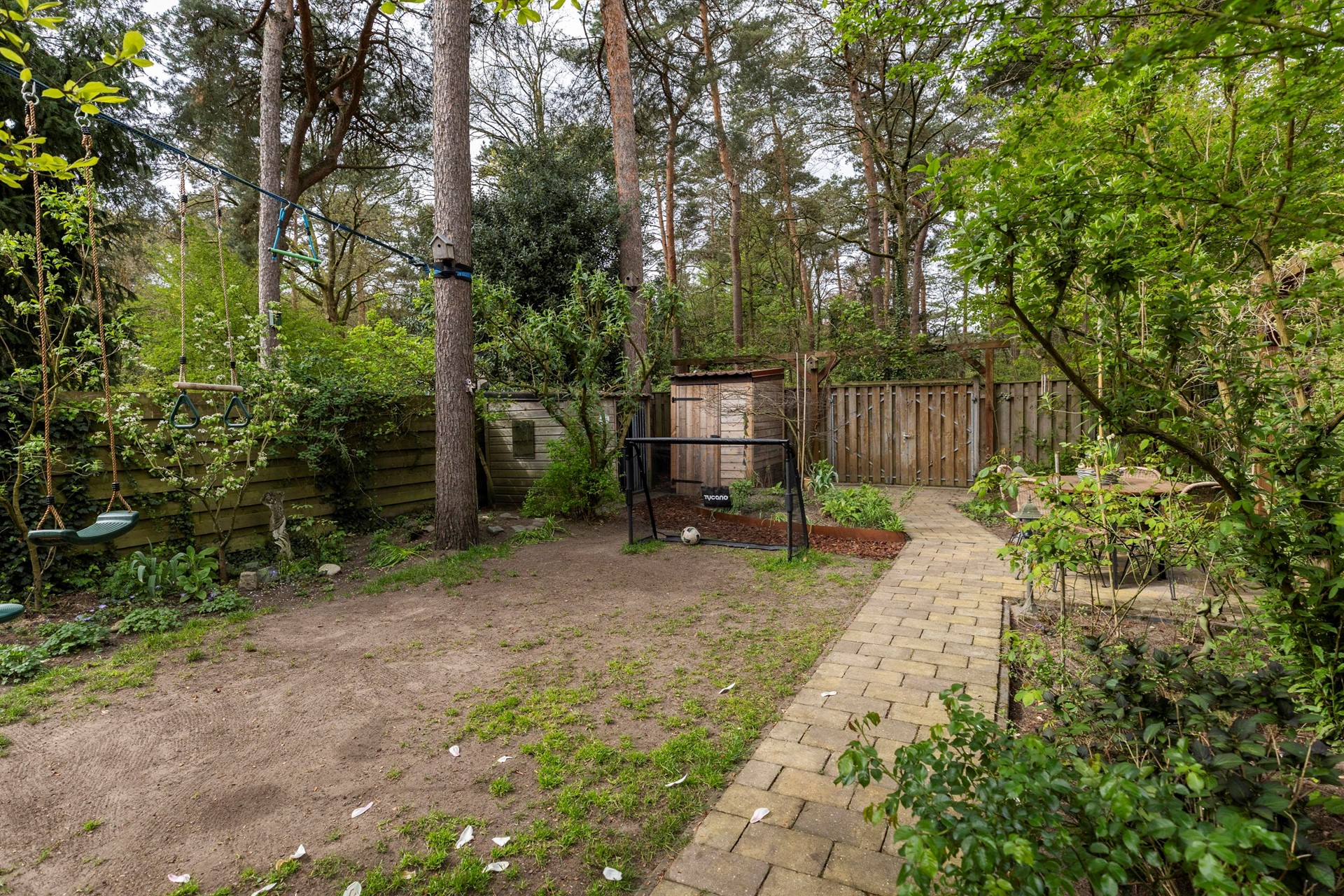 De achtertuin vormt een heerlijke plek om van het buitenleven te genieten. Deze royale, privacybiedende bostuin ligt op het zonnige zuidwesten en biedt meerdere terrassen, waaronder een terras direct aan huis en een tweede, sfeervolle plek verderop in de tuin. Met een achterom, buitenkraan, houten berging (1.75m bij 1.44m) én een saunacabine (ter overname) is het hier optimaal genieten. Bovendien loopt u vanuit de tuin zo de aangrenzende wandelbossen in – een
